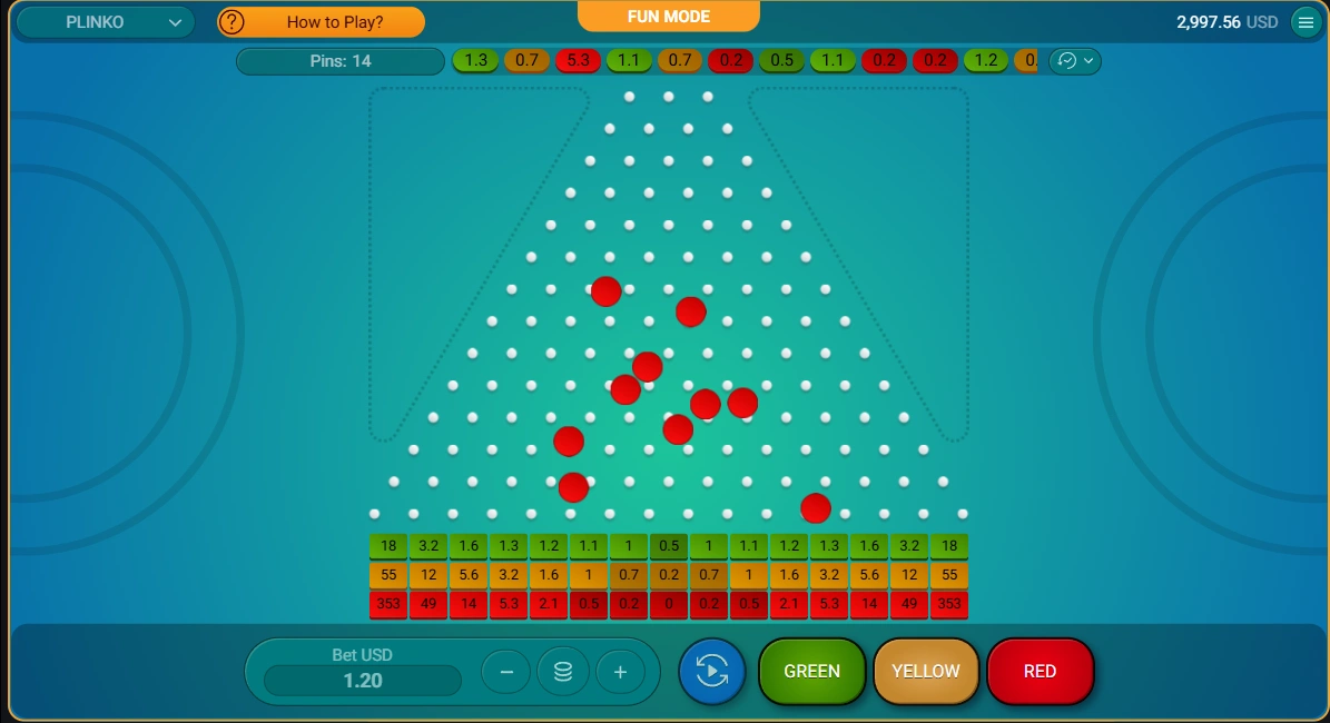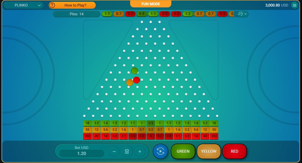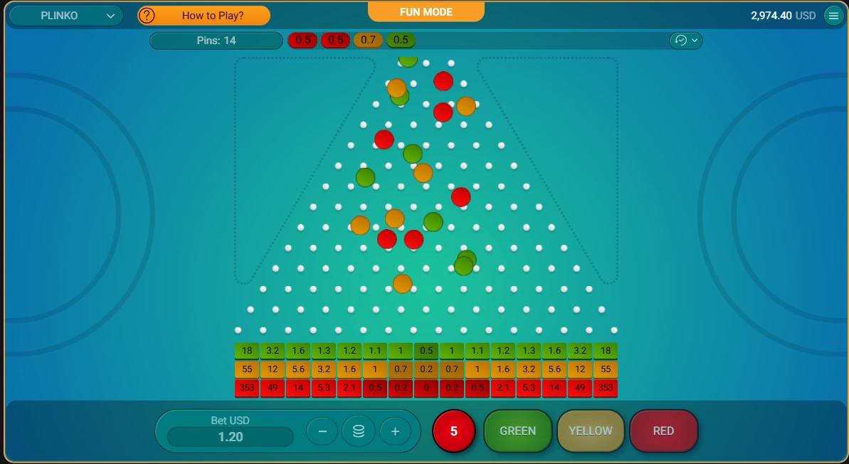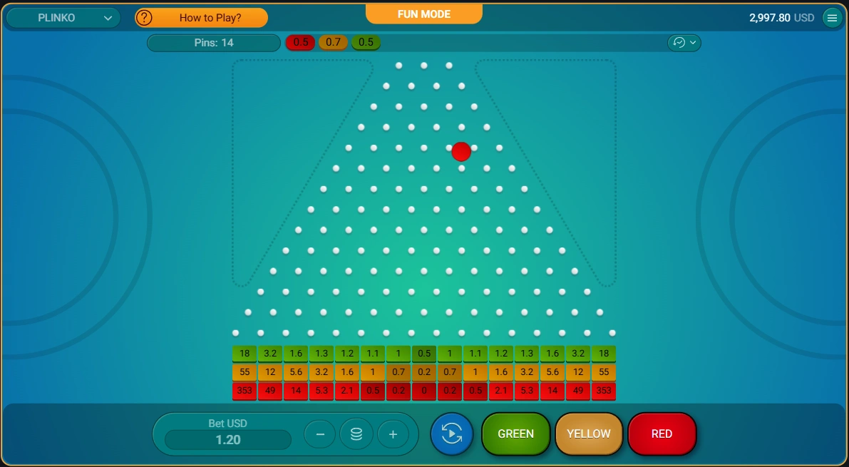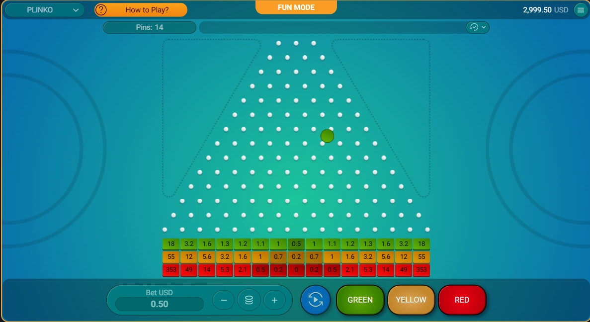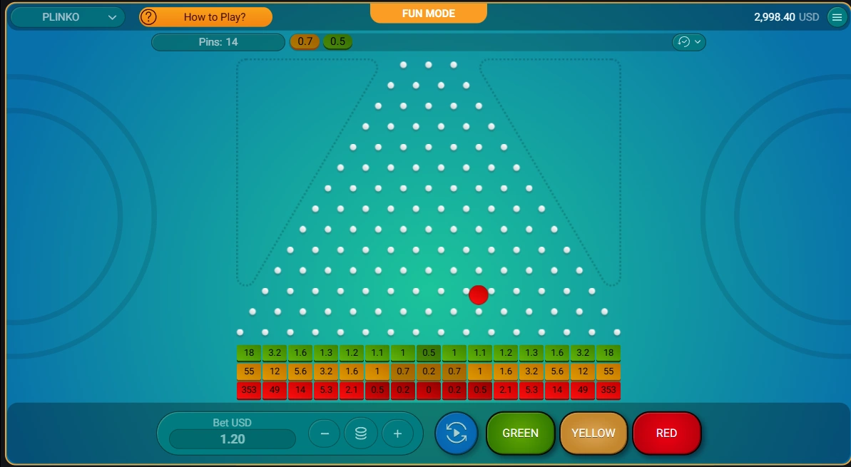 The player selects these parameters before each drop. The ball then travels through a triangular grid of pins, landing in a multiplier slot at the bottom.